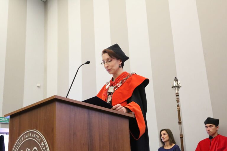 Punktualnie o godzinie 11.30 przy dźwiękach poloneza do auli wkroczył poczet sztandarowy, a w ślad za nim podążały władze uczelni: Prorektor dr inż. Andrzej Bolewski prof. ANS, Dziekan Wydziału Nauk Społecznych dr Anna Zbaraszewska prof. ANS oraz Dziekan Filii Wydziału Nauk Społecznych w Wągrowcu dr Anna Gapińska. Po wysłuchaniu utworu Gaude Mater Poloniae, czyli Ciesz się Matko Polsko w wykonaniu Zespołu Solistów Chóru Akademickiego UAM pod dyrekcją Beaty Bielskiej, audytorium miało przyjemność wsłuchać się w słowa wystąpień Prorektora dra inż. Andrzeja Bolewskiego, Dziekan WNS dr Anny Zbaraszewskiej i Dziekan Filii w Wągrowcu dr Anny Gapińskiej. Wystąpienia obfitowały w gratulacje i podziękowania dla wszystkich, którzy przyczynili się do szczęśliwego i pomyślnego ukończenia studiów, zabawne anegdoty z pamiętnika studenta, które zaprezentowała dr Anna Zbaraszewska oraz ciekawe metafory opisujące drogę do celu i moment jego osiągnięcia. Jak pisał Owidiusz finis coronat opus, czyli koniec wieńczy dzieło. Uroczystość Absolutorium była rzeczywiście wspaniałym ukoronowaniem kilkuletnich wysiłków i mozolnej pracy żaków, profesorów i administracji uczelni. Po wręczeniu przez władze wydziałów nagród za najlepsze prace dyplomowe i najwyższe średnie wyniki z zaliczeń i egzaminów głos zabrał Starosta Powiatu Wągrowieckiego Pan Tomasz Kranc, który po wygłoszeniu gratulacji i podziękowań wręczył nagrody za najlepsze wyniki w nauce i najlepszą pracę magisterską. Następnie wszyscy zgromadzeni wysłuchali przemówienia Przewodniczącego Samorządu Studenckiego pana Michała Leśniewskiego oraz Starościny Pedagogiki Przedszkolnej i Wczesnoszkolnej pani Joanny Nowaczewskiej.