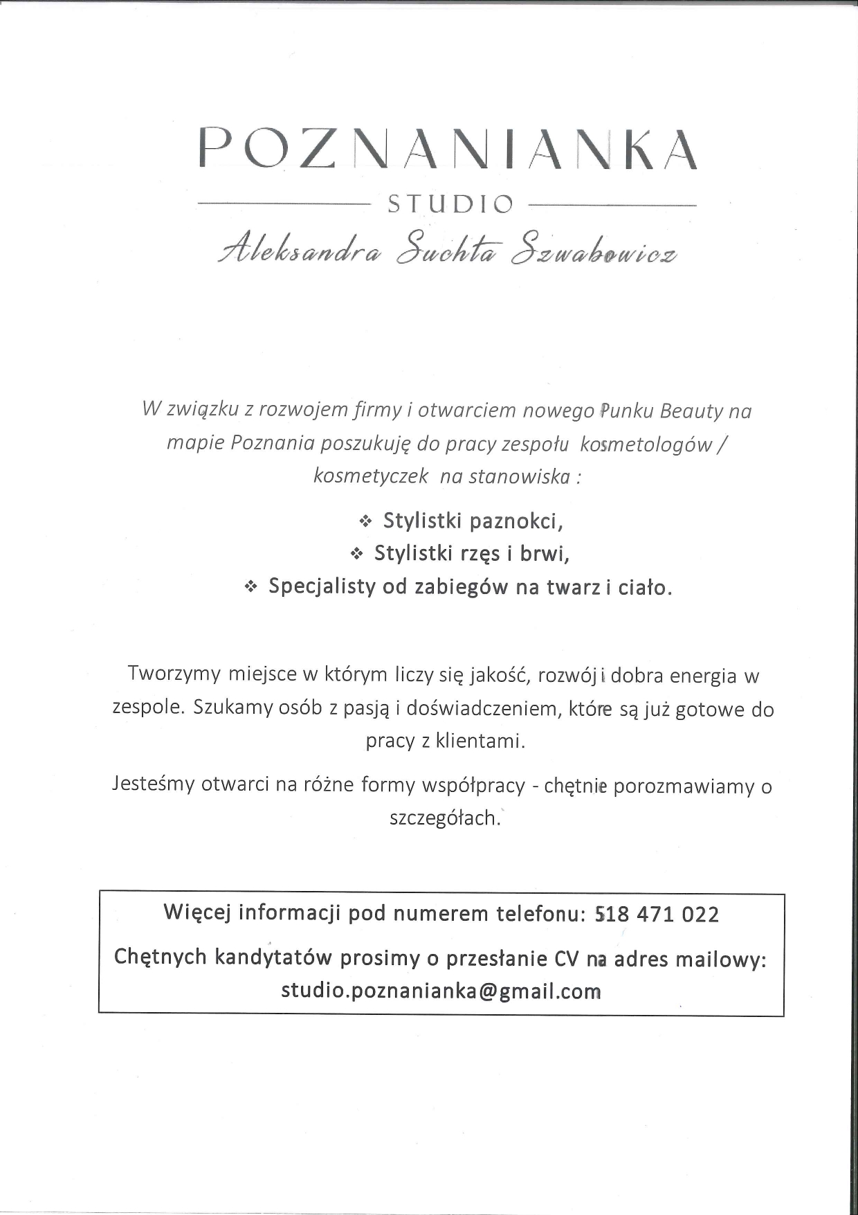 Szukamy tylko osób zainteresowanych stałą pracą. Nie oferujemy pracy dorywczej. Dla wyróżniających się studentów kosmetologii oferujemy wdrożenie do pracy kosmetologa po uzyskaniu tytułu licencjata.