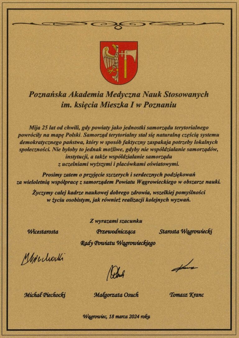 W trakcie sesji, Poznańska Akademia Medyczna została uhonorowana pamiątkowymi podziękowaniami za wieloletnią współpracę z samorządem Powiatu Wągrowieckiego w obszarze nauki.