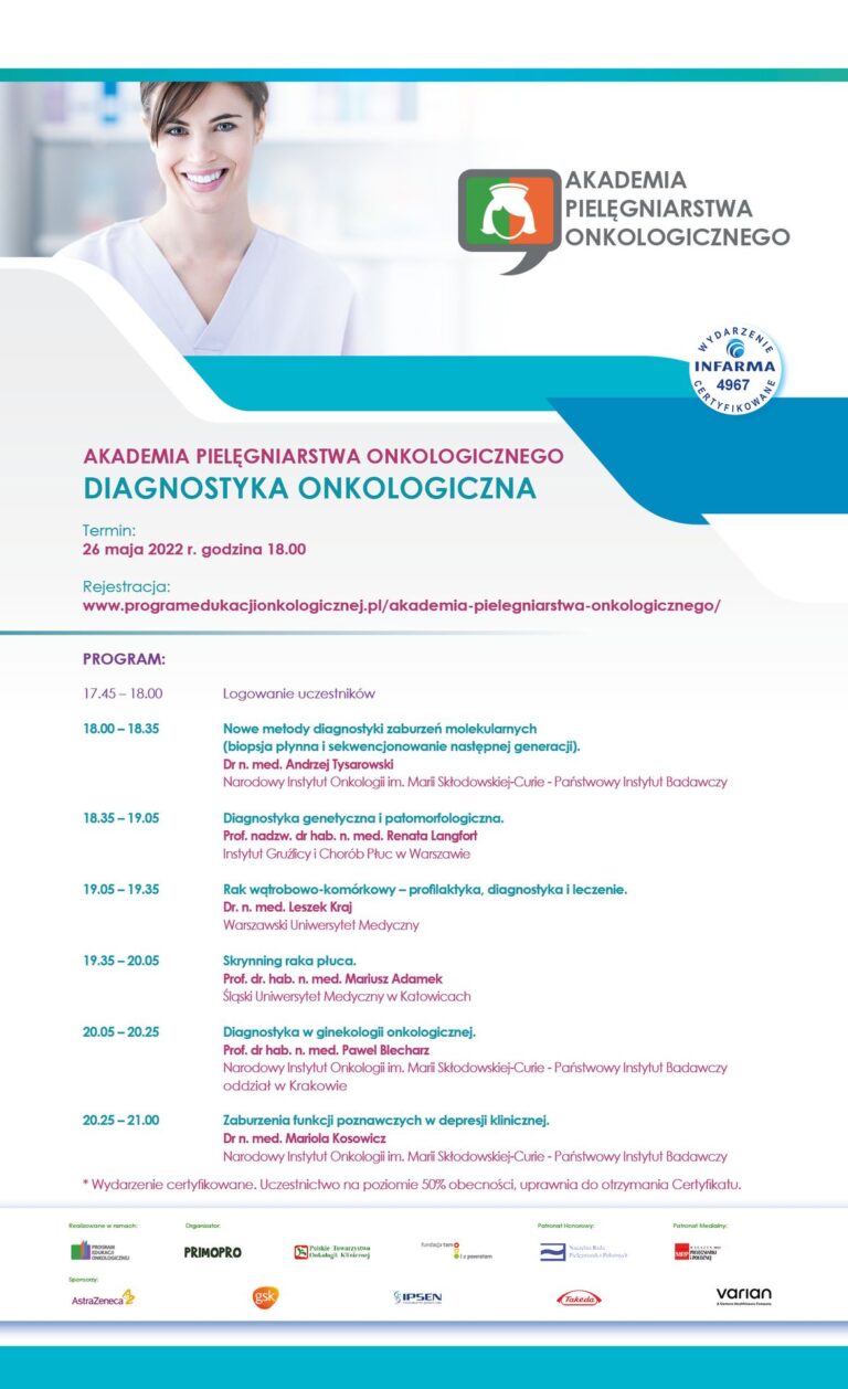 W imieniu Polskiego Towarzystwa Onkologii Klinicznej – organizatora Programu Edukacji Onkologicznej, w ramach którego działa Akademia Pielęgniarstwa Onkologicznego – serdecznie zapraszamy do bezpłatnego udziału w webinarium “Diagnostyka onkologiczna”.