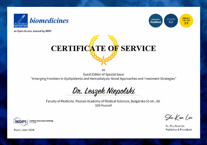 Pracownik naszej Uczelni, Wydziału Lekarskiego, dr n. med. Leszek Niepolski został Guest Editor Special Issue “Emerging Frontiers in Dyslipidemia and Hemodialysis: Novel Approaches and Treatment Strategies” Biomedicines. MDPI. Impact factor 3,9.