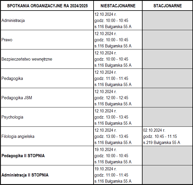 Tabela z harmonogramem spotkań dla studentów Wydziału Nauk Społecznych.