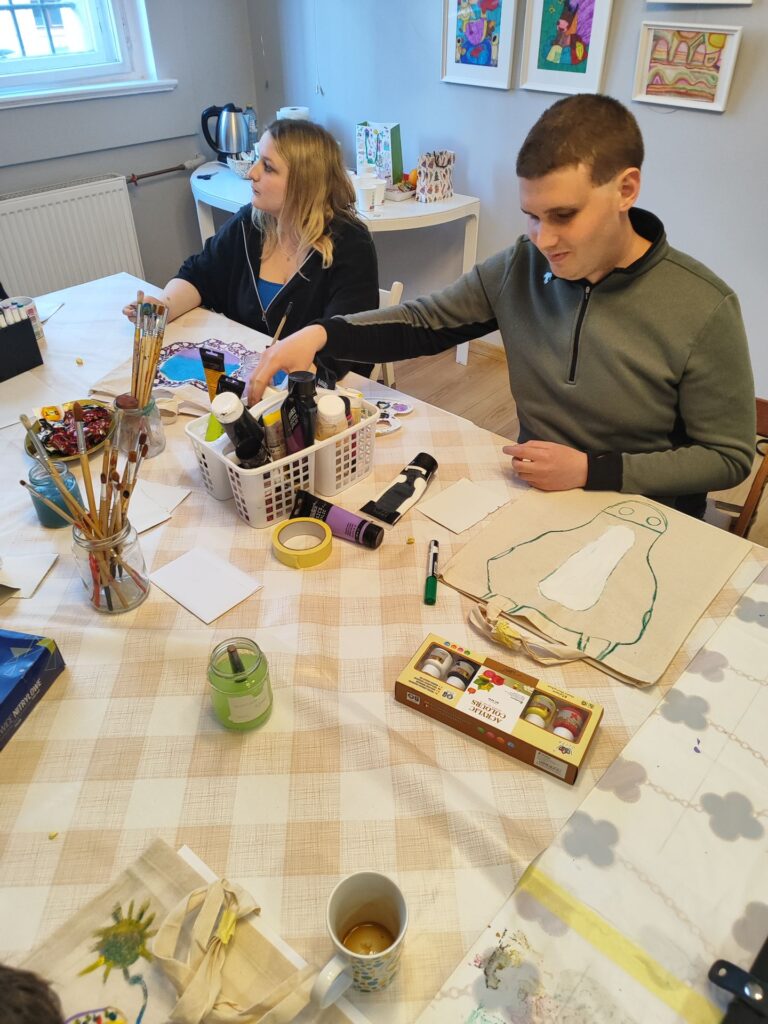 Studenci razem z uczestnikami warsztatów tworzyli torby bawełniane. Współpracowali, dobierając kolory i techniki pracy.