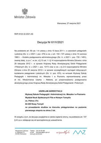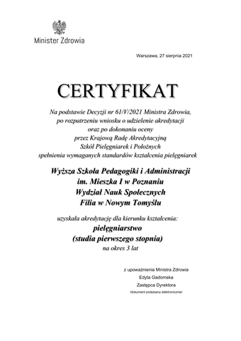 Szanowni Państwo, Chcielibyśmy się pochwalić naszym wielkim sukcesem. Wyższa Szkoła Pedagogiki i Administracji im. Mieszka I w Poznaniu Wydział Nauk Społecznych Filia w Nowym Tomyślu uzyskała akredytację dla kierunku kształcenia: Pielęgniarstwo (studia pierwszego stopnia). Bardzo się cieszymy, że dokonaniu oceny przez Krajową Radę Akredytacyjną Szkół Pielęgniarek i Położnych spełniamy wszystkie wymagane standardy kształcenia!