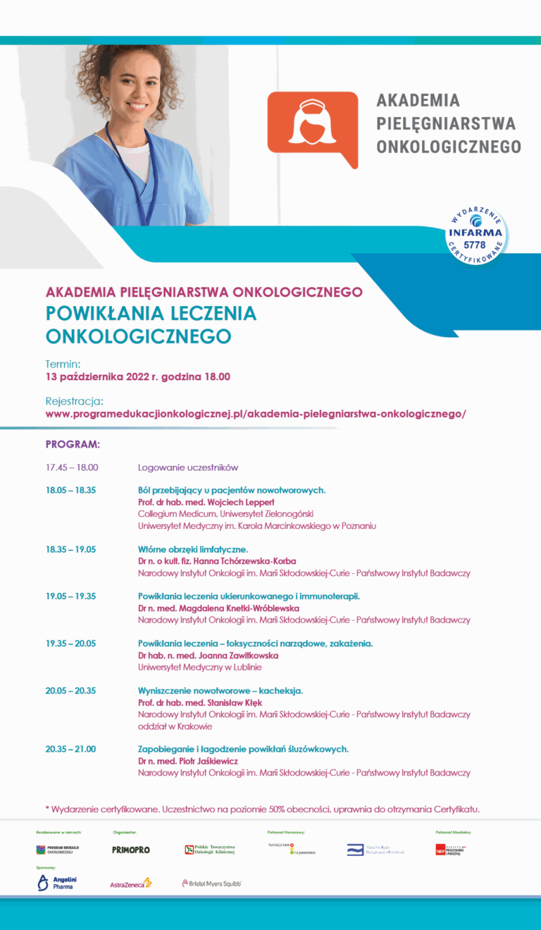 Drodzy Studenci i Pracownicy, w imieniu Polskiego Towarzystwa Onkologii Klinicznej – organizatora Programu Edukacji Onkologicznej, w ramach którego działa Akademia Pielęgniarstwa Onkologicznego – serdecznie zapraszamy do bezpłatnego udziału w webinarium „POWIKŁANIA LECZENIA ONKOLOGICZNEGO„. Szkolenie odbędzie się w dniu 13 października br. o godzinie 18.00.