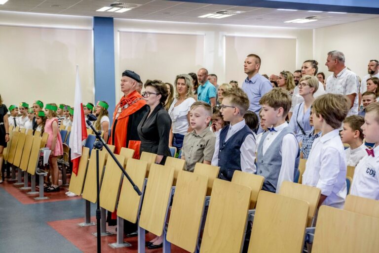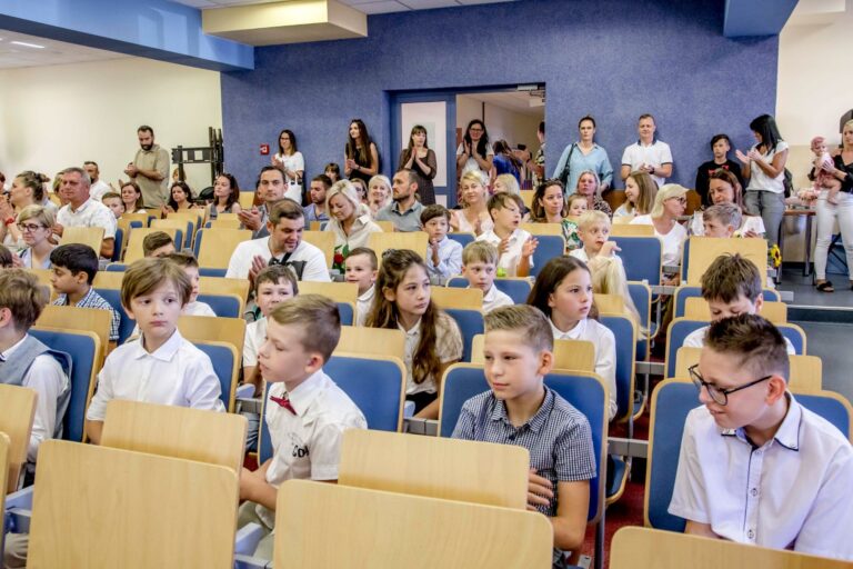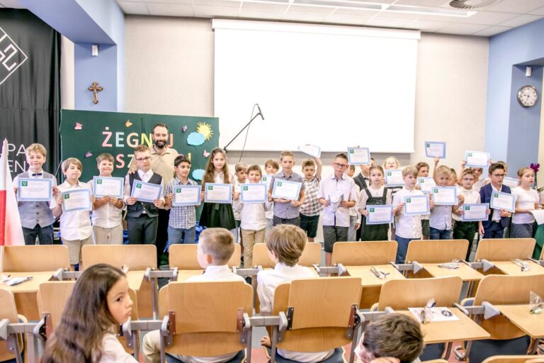 Uczniowie wraz z Wychowawcami oraz Rodzicami spotkali się w auli, by wspólnie celebrować to szczególne wydarzenie. Wychowawcy klas oraz Pan Dyrektor Dominik Handzewniak rozdali swoim podopiecznym świadectwa, a także przyznali „Sowy”- szkolne wyróżnienia za bardzo dobre wyniki w nauce oraz wzorowe zachowanie. Niespodzianką był występ artystyczny klasy 4 oraz perkusyjny koncert naszych uczniów, który poprzedziło przemówienie Prorektora Akademii Nauk Stosowanych im. Księcia Mieszka I w Poznaniu Pana dr inż. Andrzeja Jerzego Bolewskiego, profesora ANSM. Po okolicznościowych przemówieniach, rozdaniu świadectw, świadectw z wyróżnieniem, dyplomów dla uczniów, którzy brali udział w zawodach sportowych, olimpiadach Olimpusek i konkursach językowych, nastąpiło wręczenie nagrody w postaci tableta uczennicy, która w naszej szkole zdobyła najwyższą średnią ocen – Nadii Młynarczyk. Nagrodę wręczył przedstawiciel organu prowadzącego Pan Prorektor. Następnie Pan Dyrektor Dominik Handzewniak oficjalnie zamknął rok szkolny 2021/2022 i zaprosił uczniów klas 4-8 na krótkie spotkanie z wychowawcami w klasach.